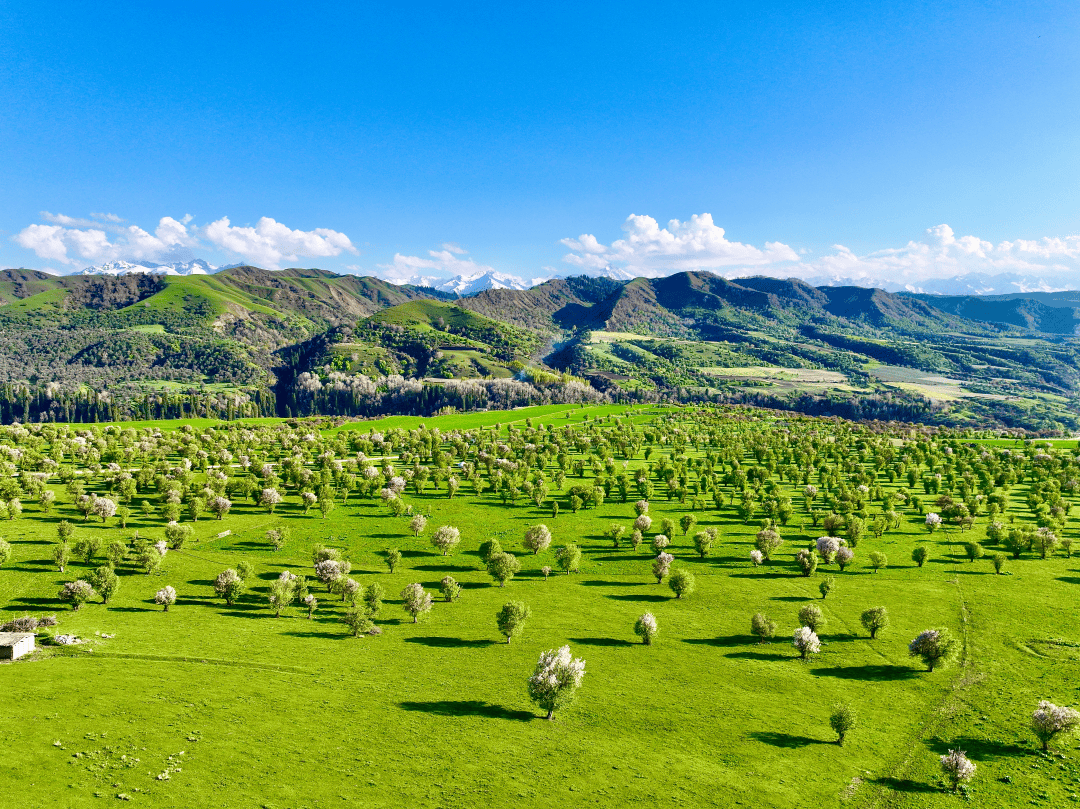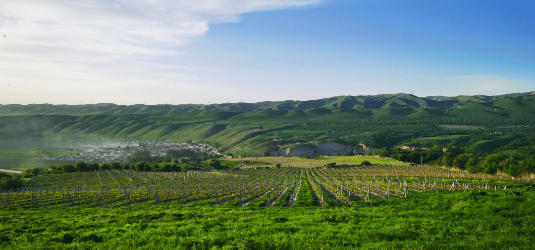 而所有的颠簸,在看到葡萄园的那一刻都变得不值一提。这里不同于新疆以往看到的任何一块葡萄园,没有戈壁,没有风沙,只有漫山遍野的青绿草甸、成片的野果林和远处牧民毡房升起的袅袅炊烟。