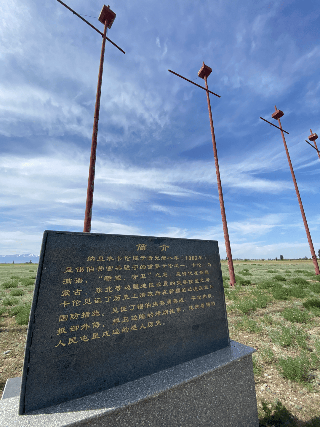 距离边境线公里处,仍保留着一些夯土围墙建筑的卡伦遗址,这是清代锡伯营官兵驻守边陲的哨所。每年农历四月十八日作为锡伯族“西迁节”,当地还会举办盛大活动,以纪念锡伯先祖从沈阳至伊犁屯垦戍边的西迁壮举。