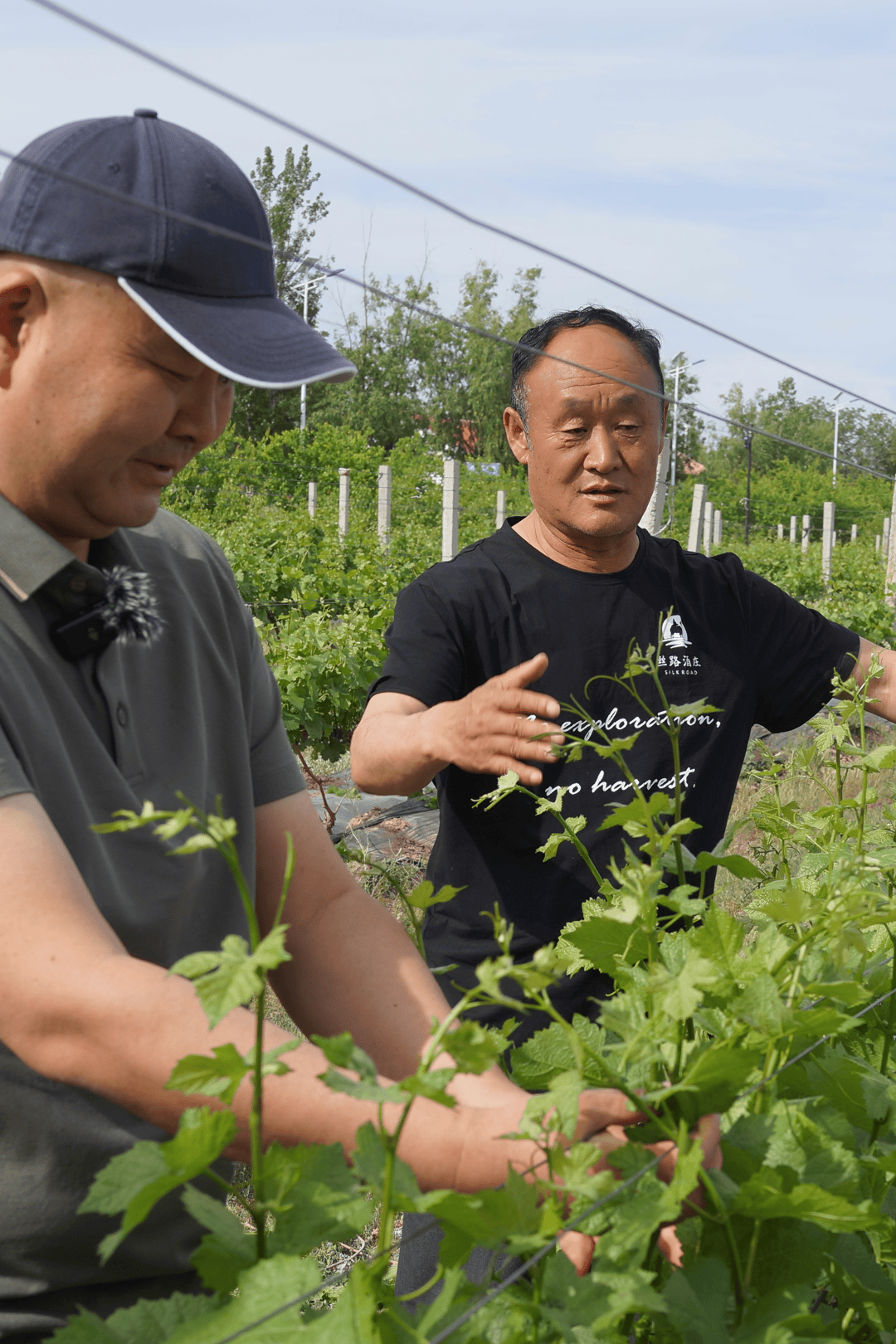 丝路酒庄种植师张银波告诉我们,眼下长势旺盛,新梢每天至少会生长5-10公分。通过抹芽去除多余的副梢,可以调节新梢长势和架面的通透度,这也是限定产量和提升品质的一项重要作业。