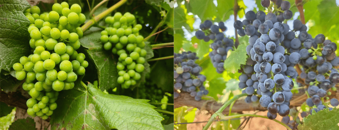 ▎2024年7月28日,张银波记录的同一品种黑皮诺同一时间在秘境葡萄园(左)和鸟巢葡萄园(右)的差异对比表现。