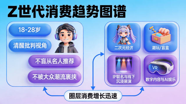 Z世代(18-28岁)为自我代言、为爱好花钱,坚定地为圈层消费。由其驱动的中国“谷子经济”(周边产品消费)市场规模预计2025年将突破2000亿元。他们生长于信息爆炸与新品迭出的时代,却也因此保持着清醒的批判视角,不盲从于名人推荐,也不轻易被大众潮流所裹挟。Z世代在“谷子经济”、潮玩/盲盒、IP联名与线下沉浸展演、数字内容与AI娱乐等圈层消费领域增长迅速。