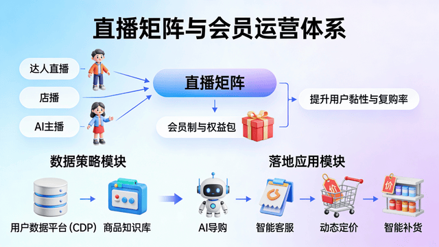 打造“达人+店播+AI主播”的直播矩阵,以会员制与权益包提升用户黏性与复购率。