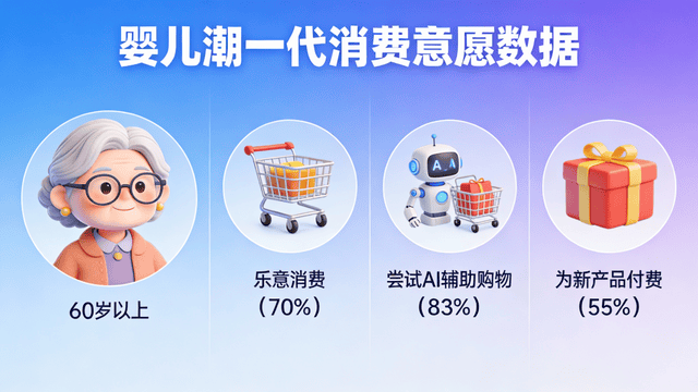婴儿潮一代(60岁以上)表现出最高的消费意愿,70%的老年消费者“乐意消费”,83%愿意尝试用AI辅助购物,55%愿意为新产品付费。他们更重视健康与高端品质,愿意为特定添加营养元素、高端成分等支付溢价,在品牌选择上倾向于信任和熟悉度。