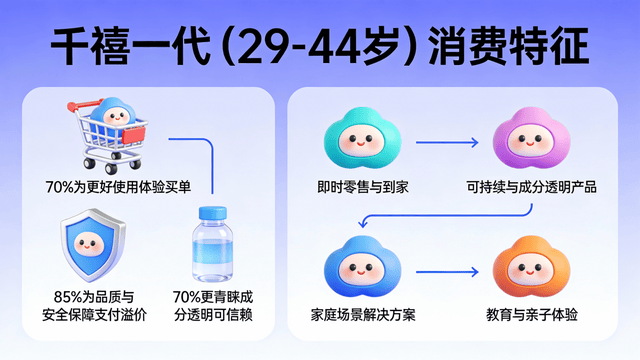 千禧一代(29-44岁)“有钱且愿意消费”,70%愿意为更好使用体验买单,85%愿意为卓越品质与可靠安全保障支付溢价,70%更青睐成分透明可信赖、供应链清晰可靠的产品。他们的“体验先行”推动即配零售、可持续产品的兴起,在即时零售与到家、可持续与成分透明产品、家庭场景解决方案、教育与亲子体验等领域消费快速增长。