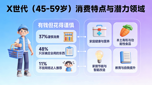 X世代(45-59岁)有钱但花得谨慎,追求精简高效,青睐健康天然的本土产品。37%的X世代谨慎消费,48%只购买确定会用的东西,仅有11%会相信网络达人推荐。针对他们的消费特点,家庭健康与营养、本土有机与功能性食品、家居节能与智能改造、教育与自我提升等领域有较大增长潜力。