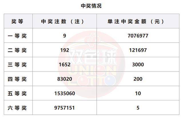 一等奖中奖情况:辽宁1注,吉林1注,浙江2注,安徽1注,江西1注,山东1注,广东1注,陕西1注,共9注,单注奖金707万。