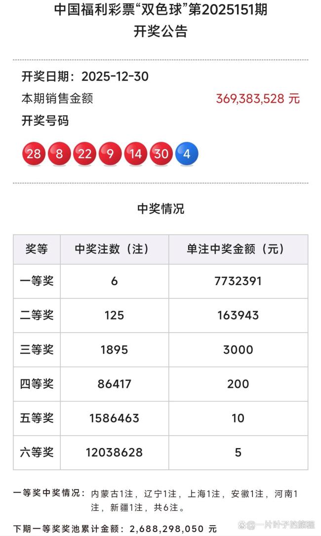 南宫28,南宫28官网,28彩票网站,28开奖,28下注,彩票赚钱,28预测,28走势分析,28开奖预测,28下注双色球开出6注头等 单注773万 蓝球大冷号04现身。2025年12月30日星期二晚,双色球游戏第25151期开奖。本期奖池总资金为26.73亿余元,总销售额为3.69亿余元。