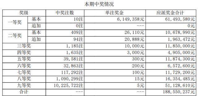 本期一等奖出自:河北(基本2注)、山西(基本1注)、辽宁(基本1注)、江苏(基本1注)、浙江(基本1注)、安徽(基本1注)、福建(基本1注)、江西(基本1注)、云南(基本1注),单注最高奖金614万。