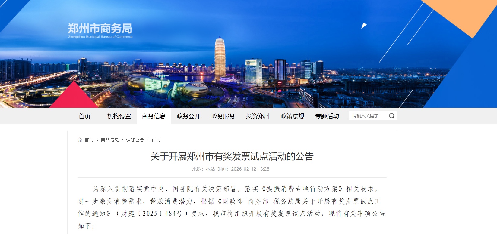 2月12日,郑州市商务局发布《关于开展郑州市有奖发票试点活动的公告》,开展有奖发票试点活动,活动总奖金规模达2.6亿元,发票参与抽奖时间从2026年2月12日持续至2026年7月8日,根据实际情况适时调整。